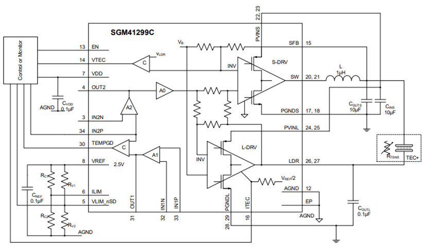 SGM4129x系列,集成式1.5/3A TEC控制器,包括差分驅(qū)動、脈沖寬度調(diào)制和斬波放大器等