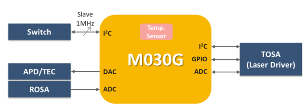 光模塊兩端分別連接了電口及光口,并在電口端利用I2C與上位機(jī)溝通。光模塊光功率會受溫度變化的影響,需監(jiān)控光模塊的溫度,并提供參考電壓做調(diào)整。因此MCU須具備量測溫度的能力—溫度傳感器,以及測量和調(diào)整電壓的能力—ADC/DAC。此外光模塊封裝尺寸狹小,因此 MCU 也必須為小封裝。