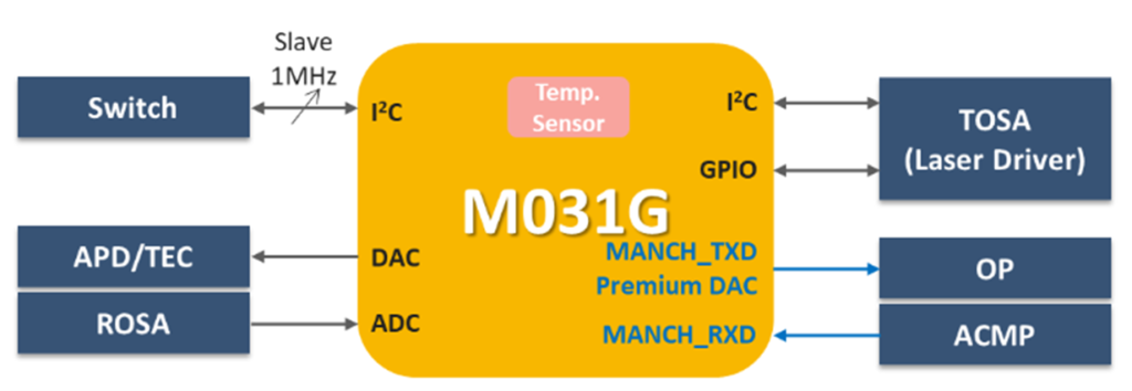 新唐的 NuMicro M029G/M030G/ M031G系列專為光模塊所設(shè)計(jì),除了充足的DAC及ADC之外,皆內(nèi)建溫度傳感器、提供QFN24及QFN33的小封裝選擇,并且配有兩組I2C接口,出廠預(yù)燒 I2C Bootloader,滿足光模塊的需求。