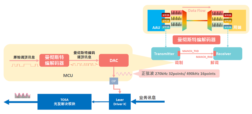 在SDH/WDM網(wǎng)絡(luò)中,每個波道通常會傳輸兩類信息,一類是業(yè)務(wù)信息,另一類是監(jiān)控和管理相關(guān)信息。監(jiān)控與管理信息,一般依附于業(yè)務(wù)信息傳遞,或使用獨(dú)立的通道資源。如果不使用獨(dú)立的通道,那么就需要調(diào)頂技術(shù)。調(diào)頂信號是在業(yè)務(wù)信號上迭加一個小幅度的信號,因此又稱為低頻微擾信號。此信號需以曼徹斯特碼做傳遞,即可利用信號的變化來保持發(fā)送和接收之間的同步。為產(chǎn)生及接收曼徹斯特碼,光模塊需具備曼徹斯特編解碼器,此處為調(diào)頂光模塊和通用光模塊最大的差異。
