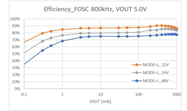 - 轉(zhuǎn)換效率高,輸出穩(wěn)定,開關(guān)頻率為800kHz。